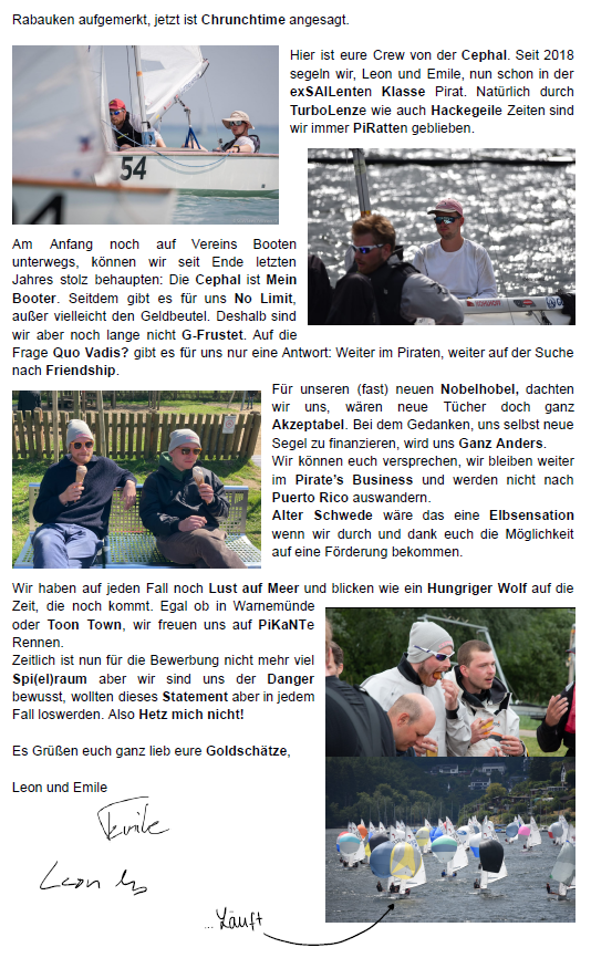 Anfangs 2024 gab es den Startschuss für die “Supporters-Förderung”, zu der sich unsere Jugend- und Junioren-Teams über die Teilnahme an mehreren Regatten in verschiedenen Bundesländern “qualifizieren” konnten. Das gepaart mit einer kreativen Bewerbung ergab in der ersten Vergabe großartige Einsendungen. Insgesamt gab es zwei Vorsegel von VM Sailmakers, einen Spi von Clown Sails sowie Einkaufsgutscheine von Clown Sails.